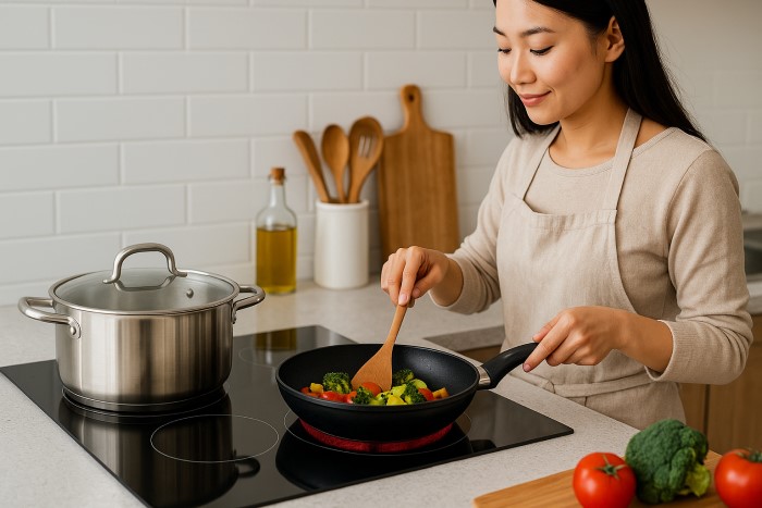 Bếp điện từ (Cảm ứng) : làm nóng trực tiếp đáy, tiết kiệm điện, an toàn.