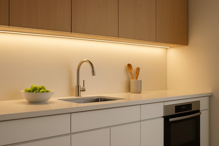 Chiếu sáng nội thất cao cấp: hắt trần, hắt tường, tủ bếp, kệ trưng bày.