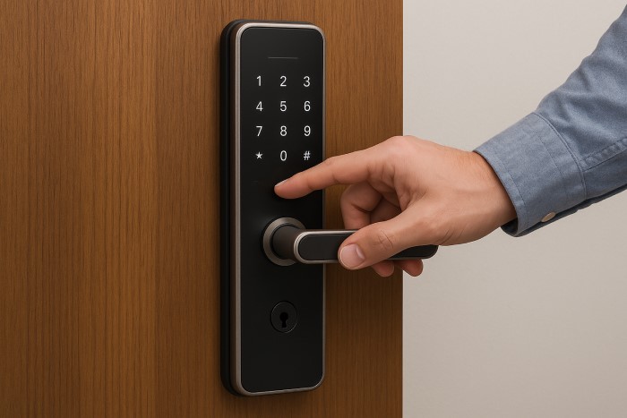 Khóa cửa điện tử kết hợp (vân tay + mã số + thẻ + app): Đa năng, an toàn tuyệt đối.