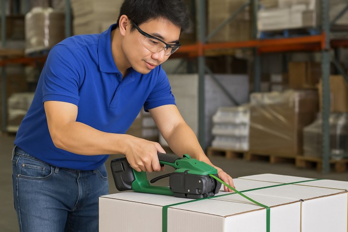 Hàng vừa – nặng / kho vận: Dùng máy pin sạc hoặc tự động dây PET.
