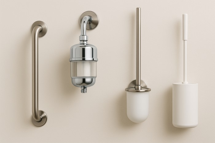 Phụ kiện phòng tắm khác như thanh tay vịn, đầu lọc nước, dụng cụ bảo vệ sinh, kệ góc 3 tầng… là những chi tiết tuy nhỏ nhưng góp phần tạo nên một không gian phòng tắm tiện nghi – an toàn – hiện đại.
