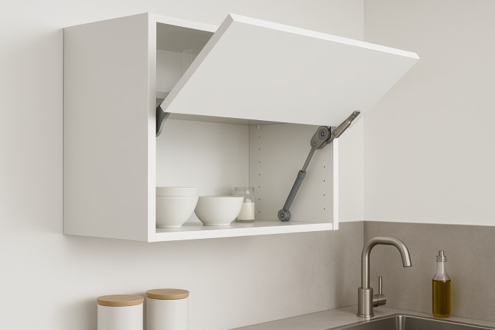 Tủ bếp trên: Tay nâng thủy lực hoặc tay nâng song hành giúp mở cánh tủ nhẹ, tiện sử dụng hàng ngày.