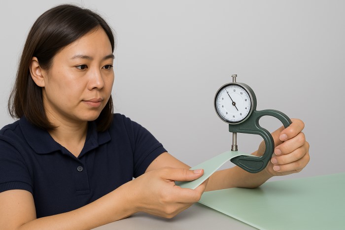 Giấy, da, cao su: Dùng thước đo cơ hoặc điện tử có đầu phẳng.