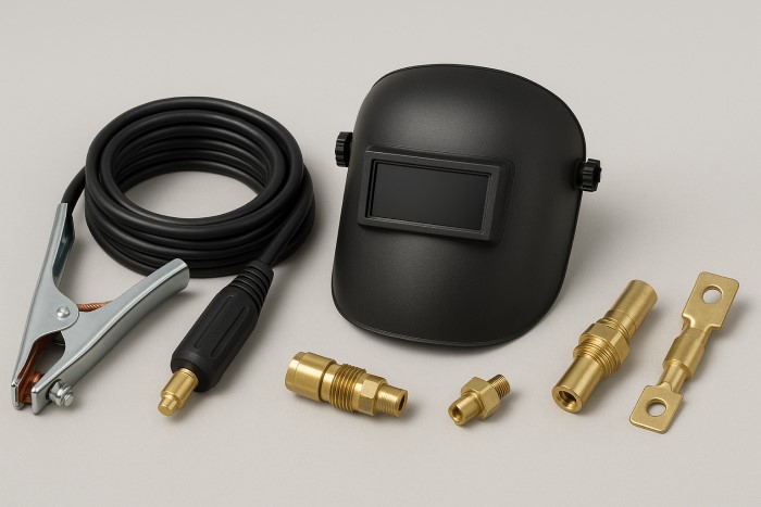 Bao gồm các loại phụ kiện, linh kiện, vật liệu bảo hộ và thiết bị hỗ trợ, nhóm này đóng vai trò quan trọng giúp máy hàn hoạt động ổn định, mối hàn đẹp, tiết kiệm năng lượng và an toàn cho người sử dụng.
