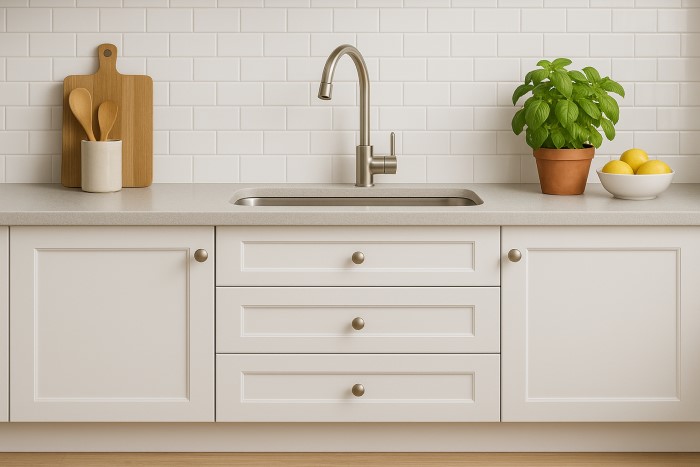 Mặt bàn bếp: Đá granite, quartz, hoặc mặt composite chống trầy.