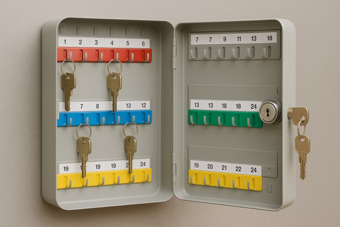 Quản lý chìa khoa học: Thiết kế theo từng hàng, có đánh số hoặc ký hiệu riêng giúp dễ dàng phân loại và truy xuất chìa.