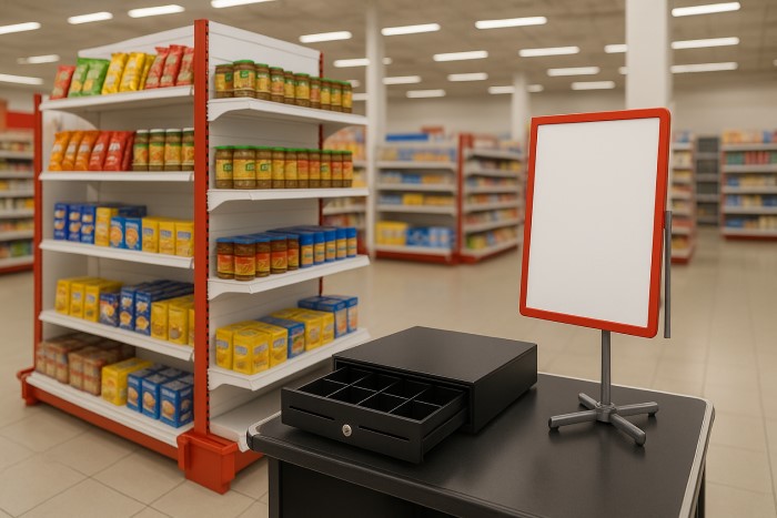 Cửa hàng tiện lợi, minimart: kệ trưng bày hàng hóa, ngăn kéo tiền.
