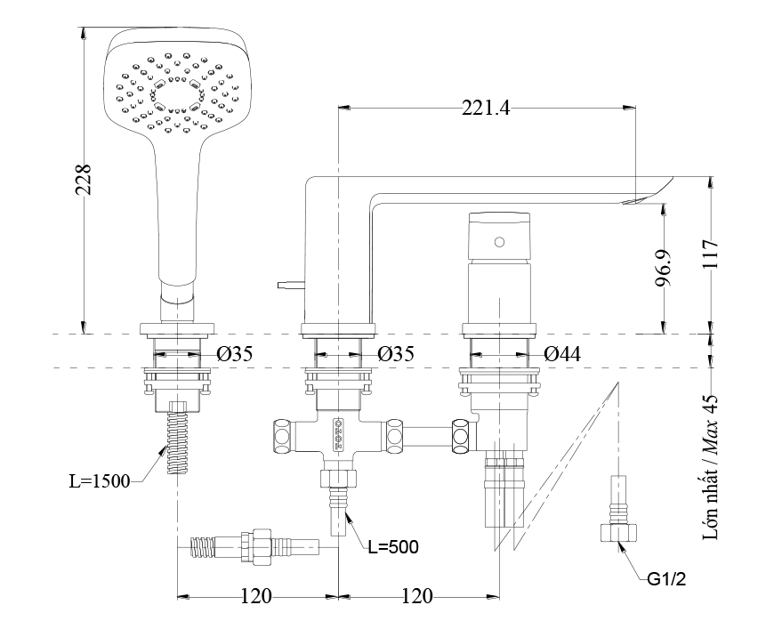 Thiết kế 3 lỗ sang trọng, phù hợp lắp trên thành bồn tắm nằm.