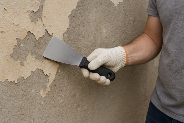 Làm sạch bề mặt: Cạo sơn cũ, keo, xi, bụi bẩn, gỉ sét hoặc lớp chống thấm hư hỏng.