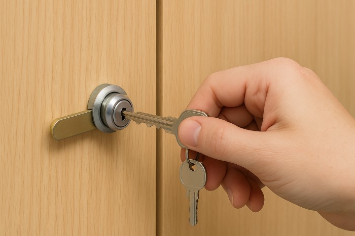 Chọn loại khóa phù hợp với cấu trúc tủ: cửa kính, cửa gỗ, cửa sắt hoặc nhựa.