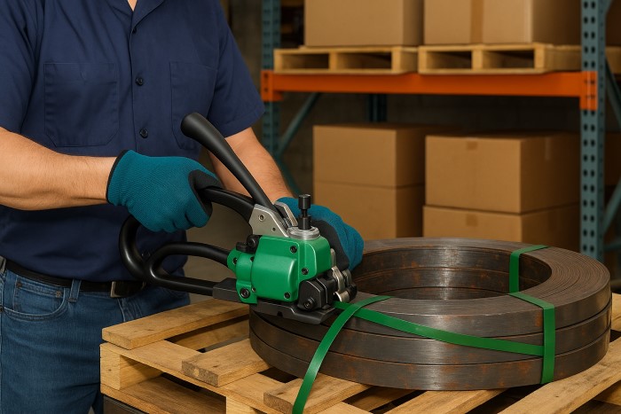Máy đóng đai thép thủ công: Sử dụng lực tay & khóa thép – linh hoạt, gọn nhẹ.