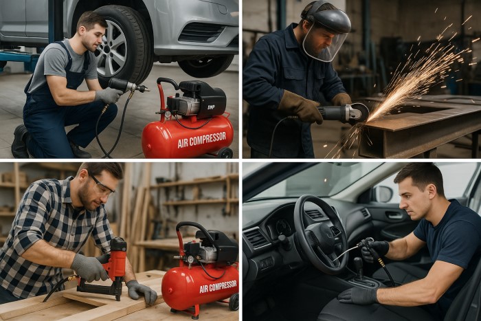 Gara ô tô – xe máy: Bơm lốp, súng mở ốc, rửa xe, vệ sinh máy móc.