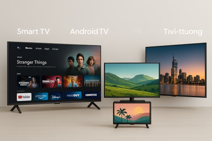 Smart TV: Hệ điều hành Android, webOS, Tizen, Google TV – truy cập Internet, ứng dụng phong phú.