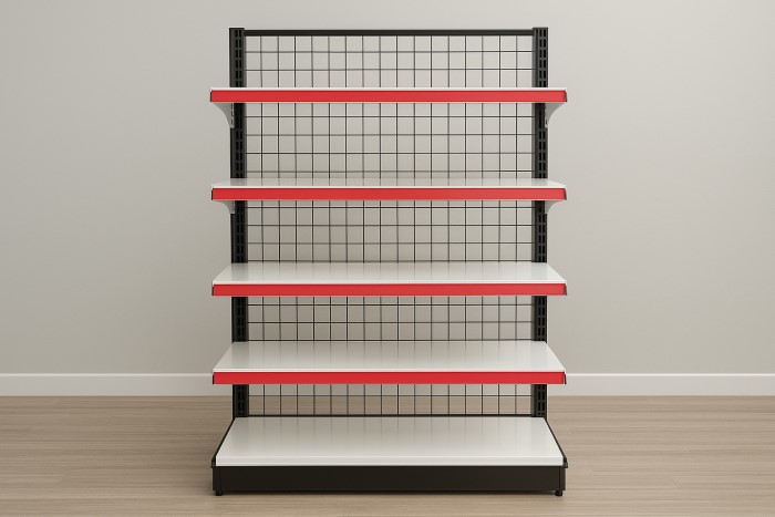 Kệ siêu thị đơn (kệ tường): Một mặt trưng bày, áp tường, phù hợp không gian nhỏ.