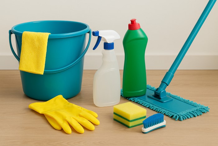 Dung dịch & phụ kiện vệ sinh: nước lau sàn, khăn lau, găng tay.