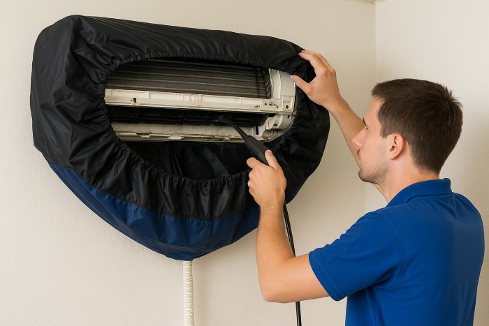 Áo Trùm Vệ Sinh Máy Lạnh là dụng cụ cần thiết giúp bảo vệ không gian & người dùng trong quá trình vệ sinh điều hòa, đảm bảo sạch sẽ – an toàn – chuyên nghiệp – tiết kiệm thời gian.