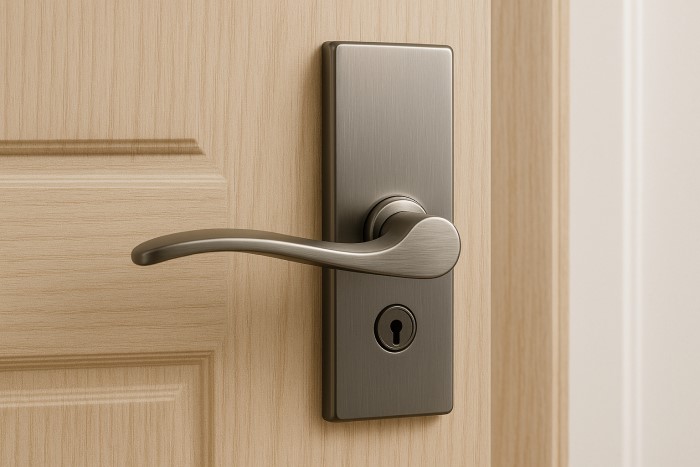 Cửa khách sạn, chung cư: Khóa tay gạt kết hợp chìa khóa hoặc nắp bảo vệ ổ khóa.