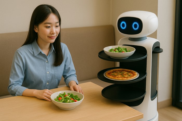 Đặt khay món lên robot, chọn bàn phục vụ → robot tự di chuyển & chào khách.