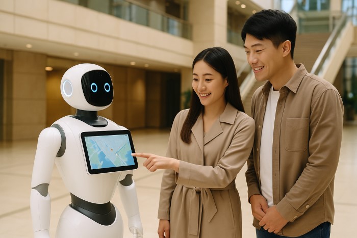 Robot hỗ trợ dịch vụ (Concierge Robot): Dẫn khách đồng thời kết nối nhân viên lễ tân hoặc hệ thống CRM.