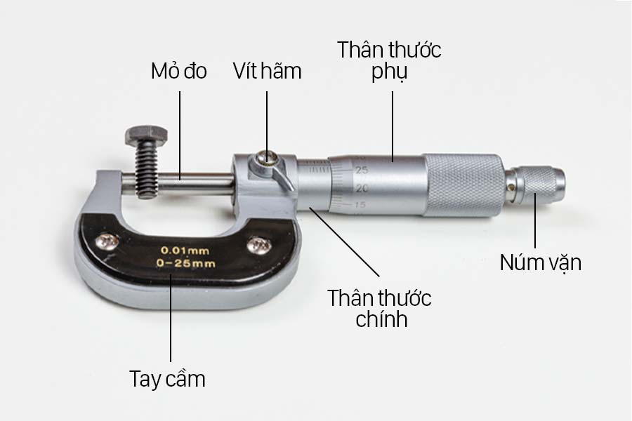 Đo vật tròn, chi tiết ngoài: Panme đo ngoài 0–25mm hoặc 25–50mm.